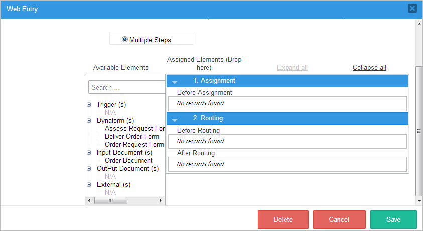 Multiple Steps: Choose this option to add one or more steps to the Web Entry. A step can be a Dynaform, input document, output document, trigger, or an external step. The user will be redirected to the first step after accessing the Web Entry link, then to the second and so on.