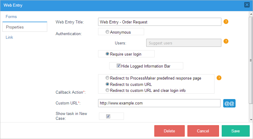 Custom URL: A complete domain and port name where the user will be redirected to when the Web Entry is completed. Note that this field is only available if the callback action selected was Redirect to custom URL or Redirect to custom URL and clear login info.