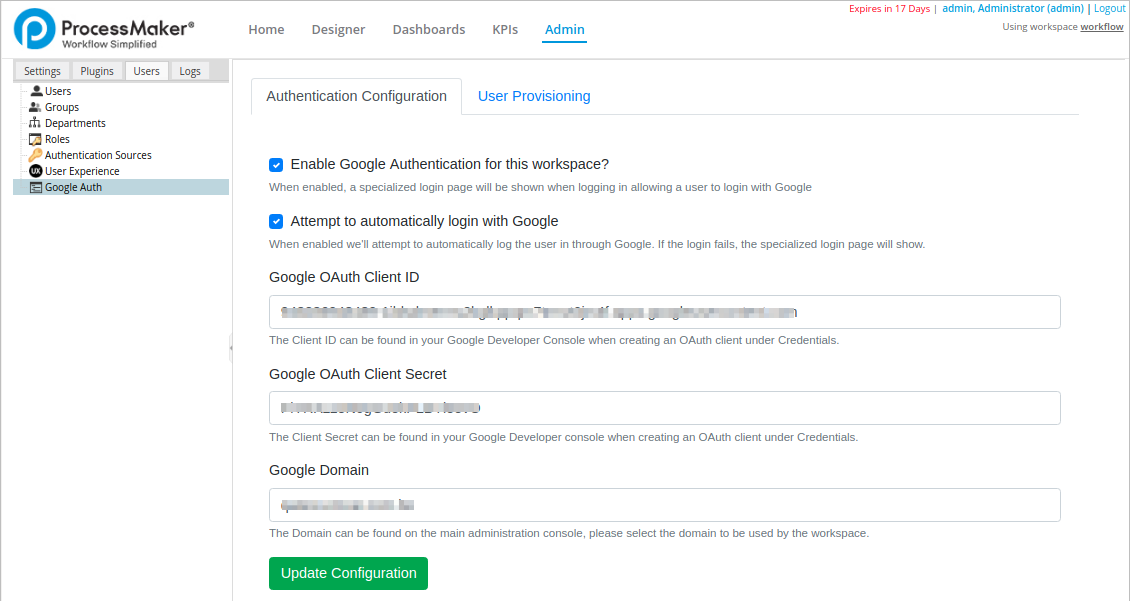 After the Google Authentication plugin is installed and enabled, an IT administrator must configure the plugin to integrate with Google authentication. After the plugin is integrated, Google authentication is enabled across the ProcessMaker application.