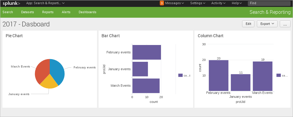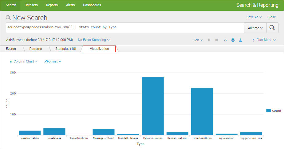 Each data search can be turned into a chart by clicking the Visualization tab. The following chart shown below corresponds to the previous example that filters the records by process UID.