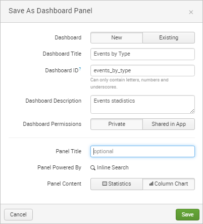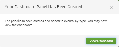 In the Save as Dashboard Panel window, define a new dashboard to save the panel to or select an existing panel. In this example, create a new panel named "Events by Type".