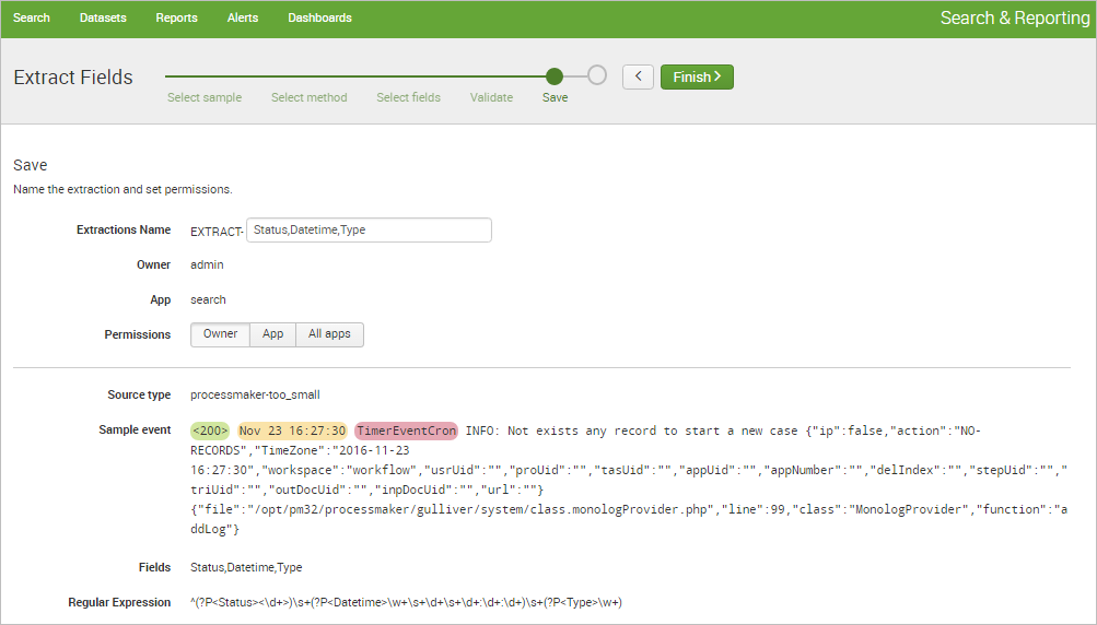 In the Save step, verify that the name that the field extractor provides is correct, change its permissions, and save the extraction by clicking the Finish button.