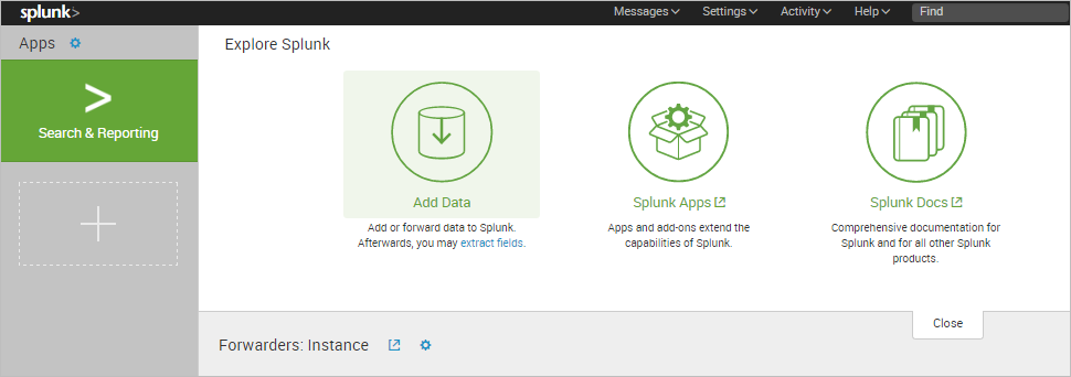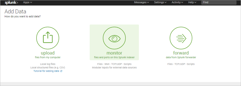 Once Splunk has been installed, the Splunk Wizard is displayed. Since the ProcessMaker Log location needs to be added, click the Add data option.