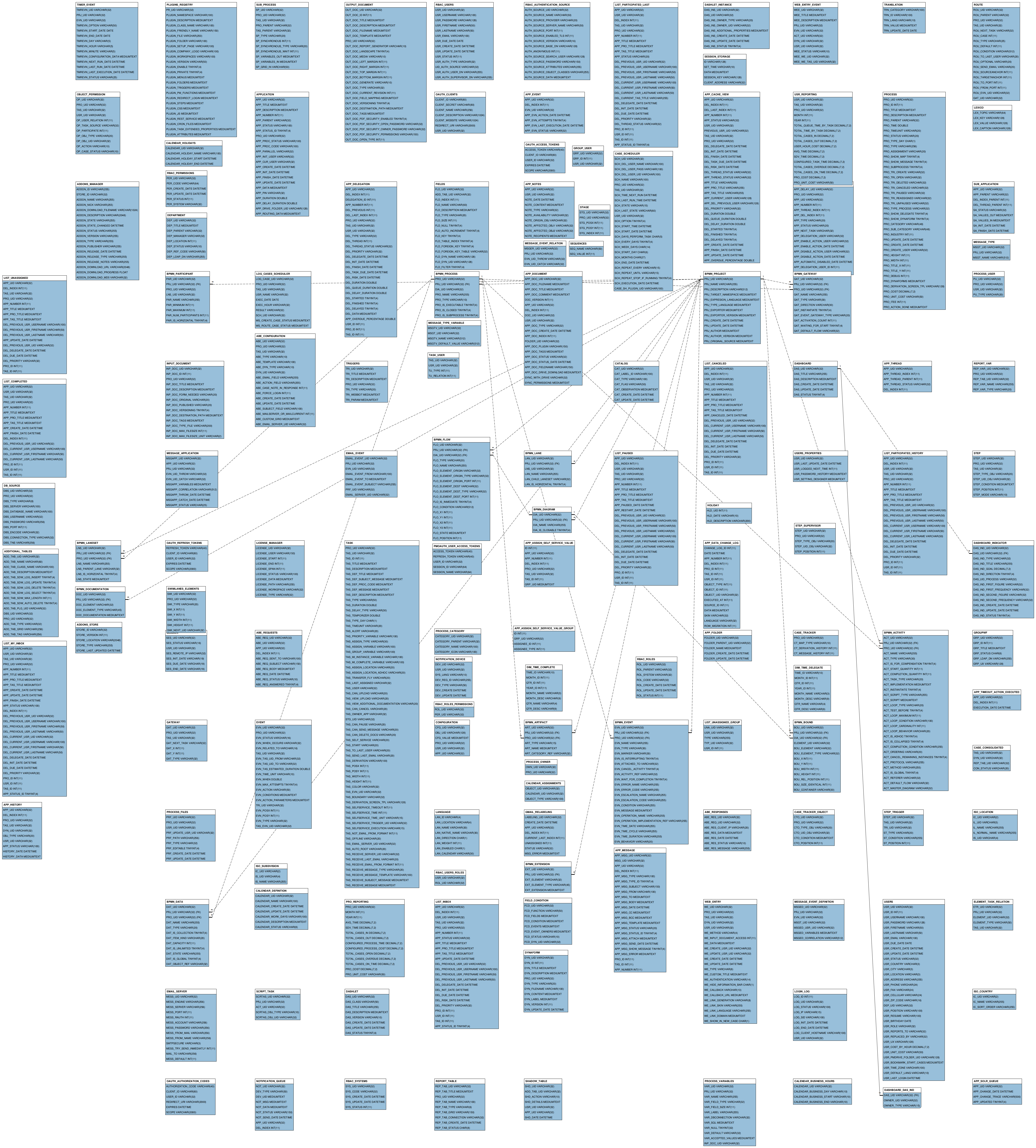 The following tables describe all the changes made to the ProcessMaker Database Schema from ProcessMaker version 3.3.16 to 3.4.x. These changes include new tables and fields, updated fields, new keys and field type changes. Notice that no field has been removed, which means that existing records won't get lost when upgrading from ProcessMaker 3.3.16 to 3.4.x.