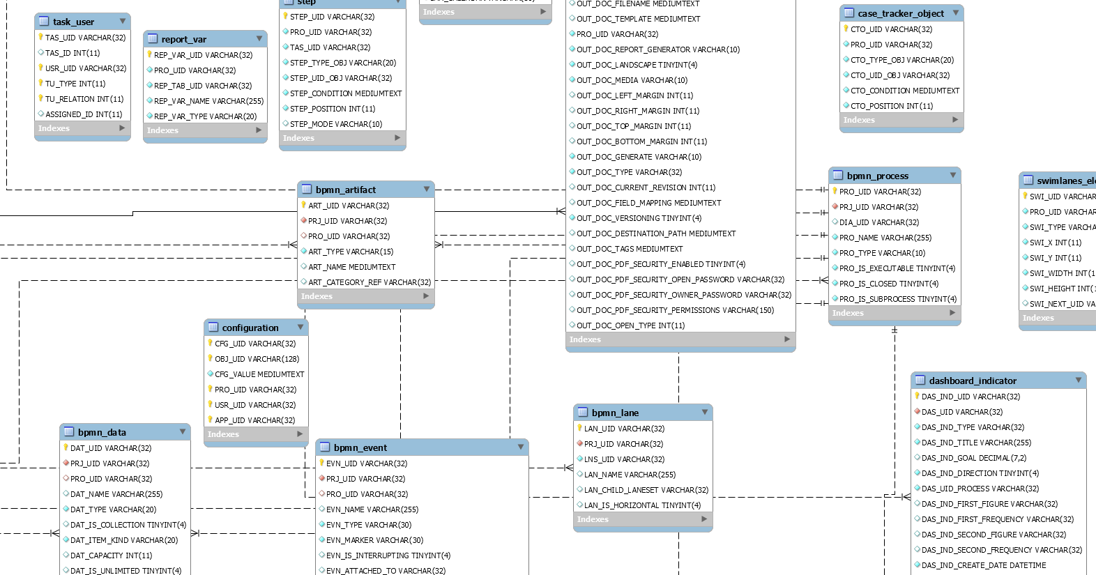 The following tables describe all the changes made to the ProcessMaker Database Schema from ProcessMaker version 3.5.x to 3.6.x. These changes include new tables and fields, updated fields, new keys and field type changes. Notice that no field has been removed, which means that existing records won't get lost when upgrading from ProcessMaker 3.5.x to 3.6.x.