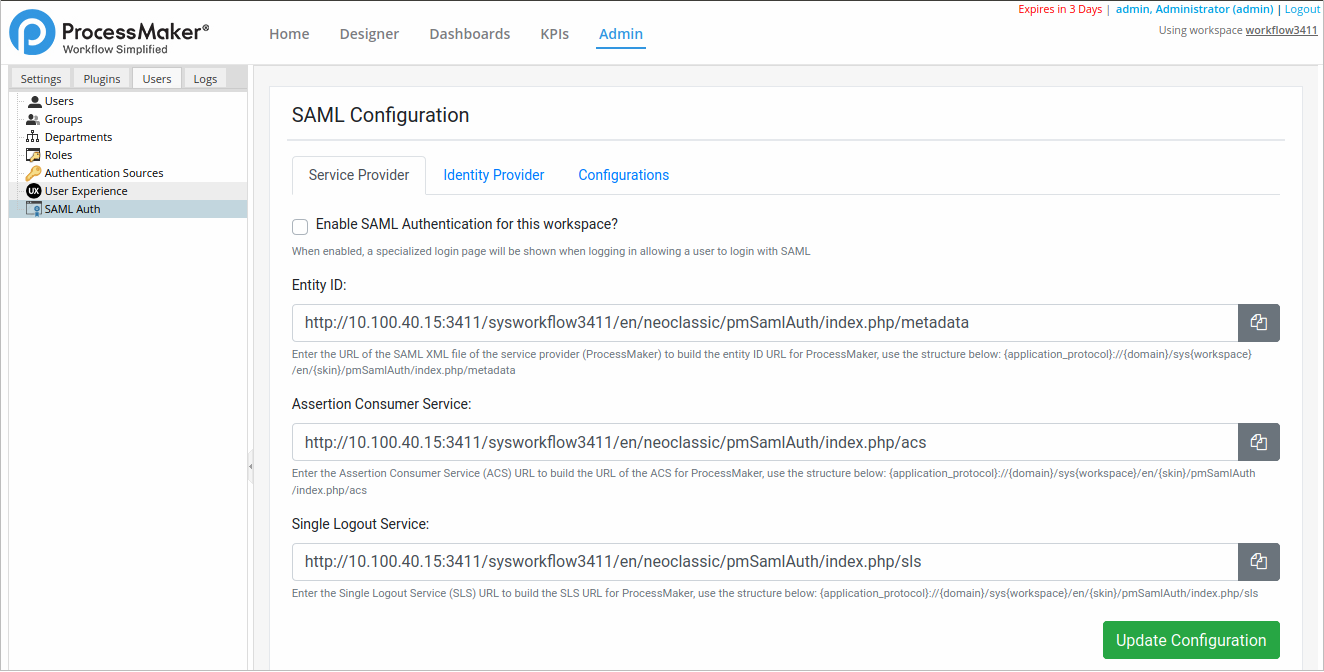 Go to Admin > Users > SAML Auth. The SAML Configuration panel displays and the Service Provider tab displays by default. Click Service Provider to view this tab when it is not currently selected.
