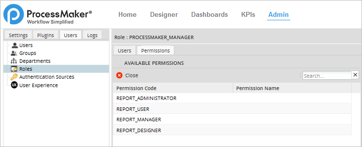 Go to Admin > Users > Roles to assign these permissions to one or more roles. It is possible to combine these permissions in a single role. For instance, a user can have the REPORT_DESIGNER and REPORT_ADMINISTRATOR permissions at the same time.