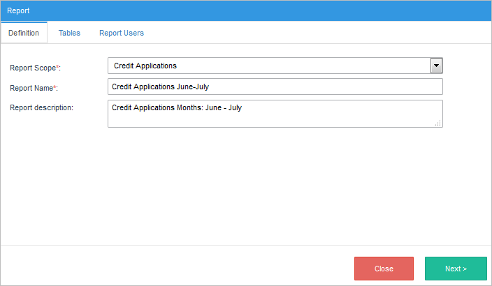 The Report Definition dialog will be display. Complete the following fields: