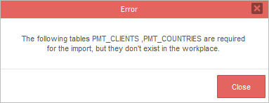 Report tables and PM tables associated with the imported scopes must already exist in the current workspace. Otherwise, the following error message will display.