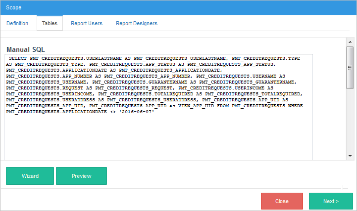 To create a new scope, click the Create button.The Scope wizard will guide the user step-by-step through creating a query to retrieve data from the tables and defining the data scenario that the report designer will use when creating the final reports. First, the scope definition dialog will be displayed where the user should fill out the following fields: