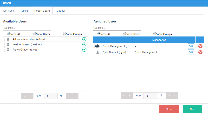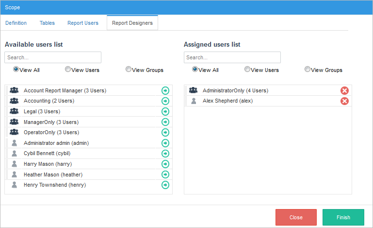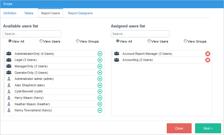 In the Report Users tab, select the users or user groups from the left list to assign them as report users. The list of available users and groups that the user can choose from is limited by the users and groups defined in the report scope.