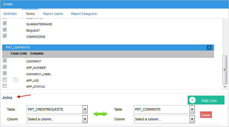 • Tables: In the tables section, all the report and PM tables from all processes are available to be chosen. Select one or more tables and the fields of each table will display in the Selected Tables section. It is recommended to include only the necessary tables in the scope of the report to ensure that only necessary data is included.