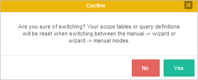 Take into consideration that if the user edits the wizard configuration manually with the Edit SQL option, the wizard configuration set up before, will be overridden by the SQL query modification and an alert message will display to confirm the action.