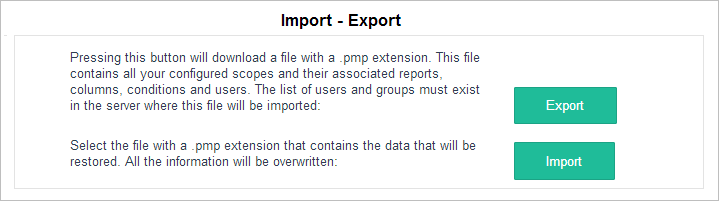 • In ProcessMaker, only assigned groups in the scope and report configuration will be included in the export. The members of a group are not exported. Therefore, single users must be assigned again once the scope is imported.