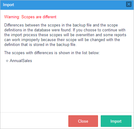 • Existing scopes and reports will be compared with the ones that are imported. If they are different, the following window will be display to confirm the action: