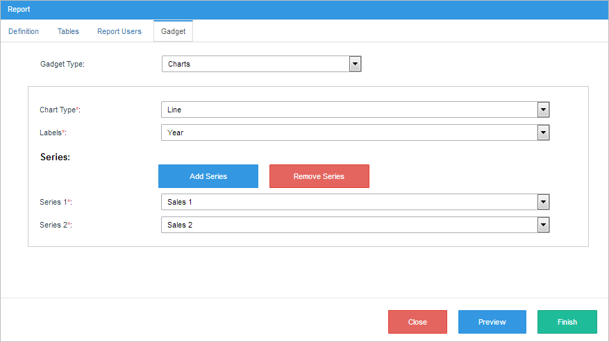 The Gadget tab allows the user to select between two types of reports: table and charts. The steps the user will have to complete to create the report will depend on the report type selected.