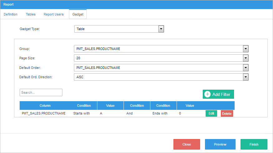 • Add Filter: Add a filter to narrow the data displayed in the table report.