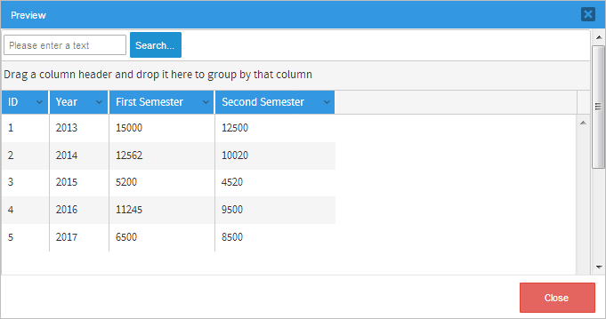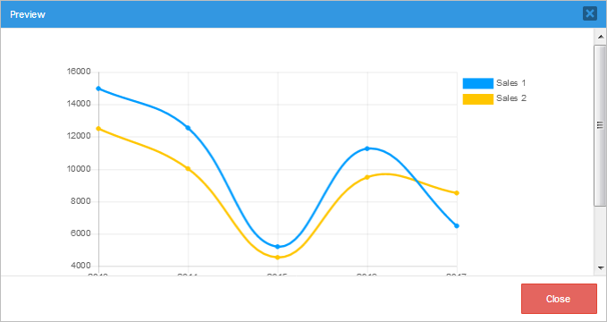 Once the configuration is set, the user designer can click on Preview to see how the final report will look like in the dialog window that is displayed.