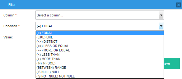 • Condition: Select the condition that will be applied to the column's values. This field is required.