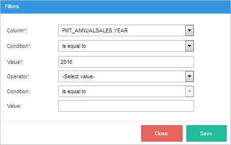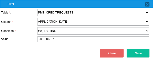 • Filters: The Filters section displays the criteria that is used to limit the number of rows of data that are retrieved. Select the appropriate condition from the corresponding dropdown list and enter the relevant value in the textbox (if applicable). In this example, all the records in the report table "Credit Requests" are selected, with the exception of records with the date: "2016-06-07".