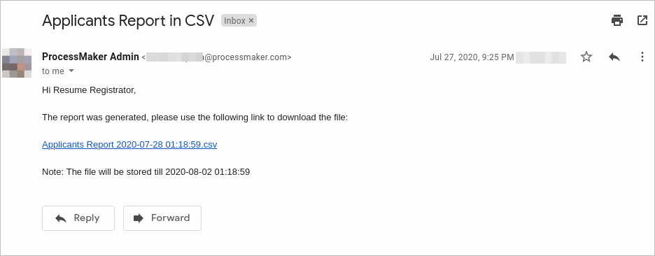 • Export: ProcessMaker sends an email to the report requester that includes a link to the generated report file. This is an example of an email sent to a report requester:
