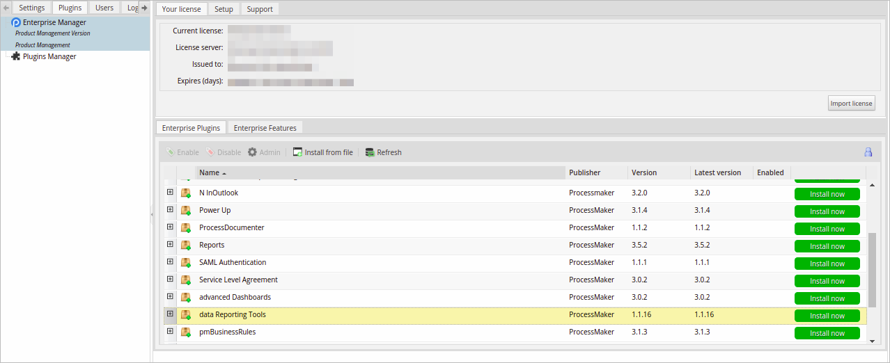 Log on with a user such as "admin", who has the PM_SETUP_ADVANCE permission in their role and then go to ADMIN > Plugins > Enterprise Manager. Either install the Data Reporting Tools plugin by clicking on Install from File and upload the plugin file or by clicking on its Install Now or Upgrade now button in the list of available plugins. For more information about plugin options, see Enterprise Manager Tool.