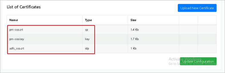 In the List of Certificates section browse the downloaded files and select the downloaded sp, key and IDP certificate files.