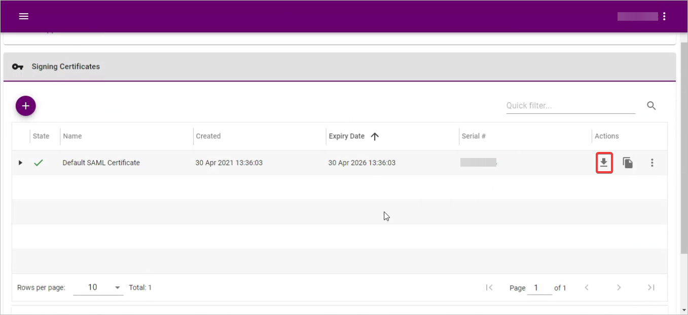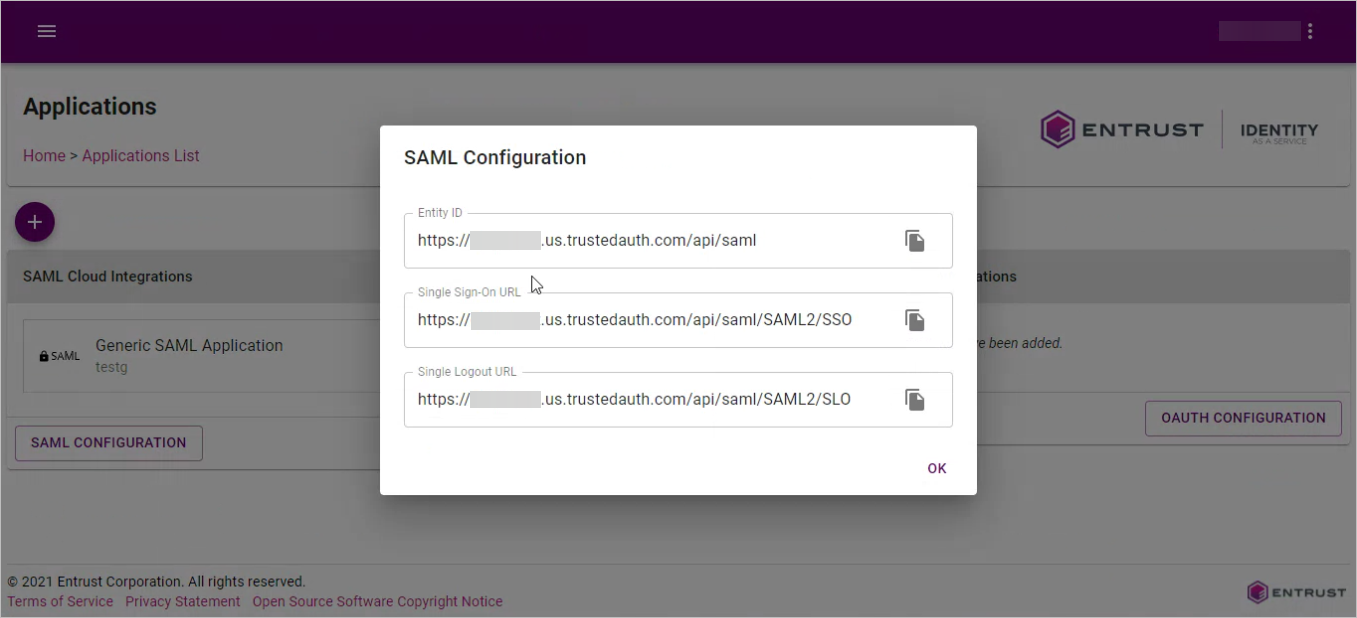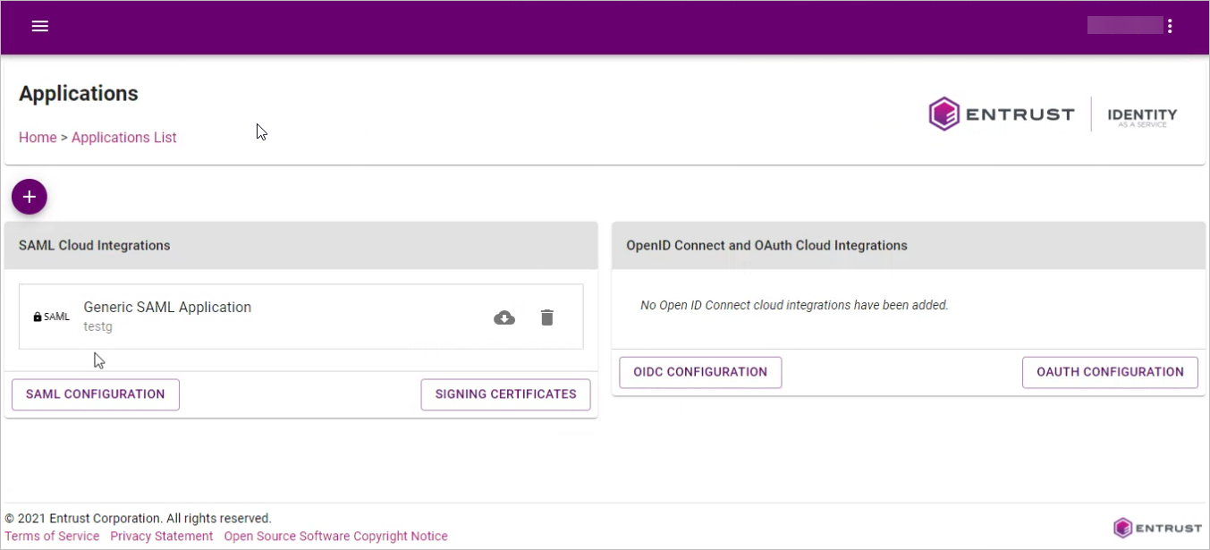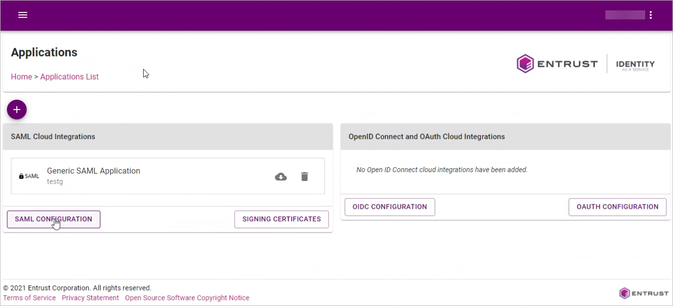 20. In the Applications List page, click on SAML CONFIGURATION.