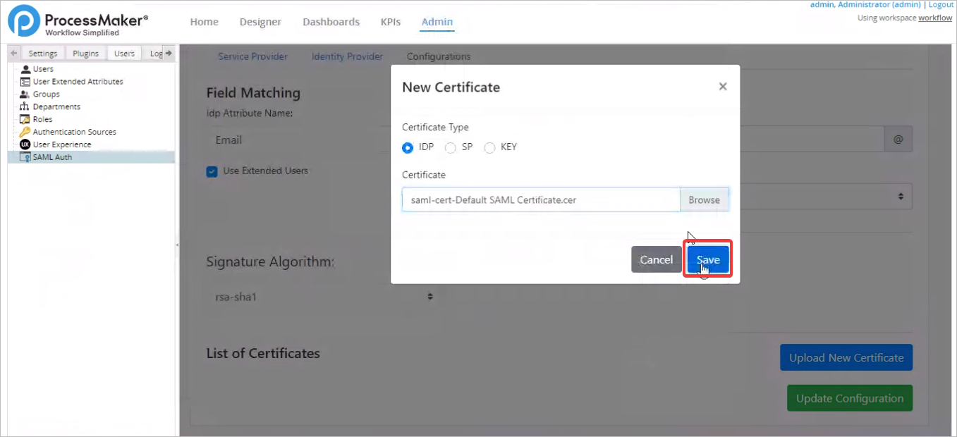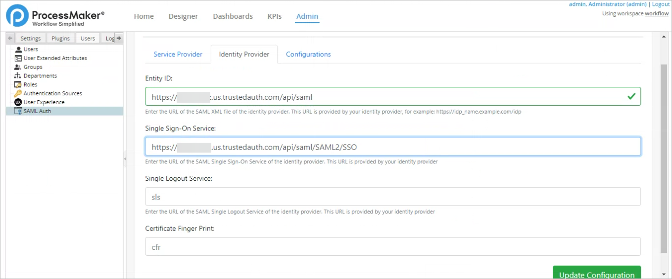 18. In ProcessMaker, select the Configurations tab, fill the Idp Attribute Name field with the attribute mapped in Entrust.