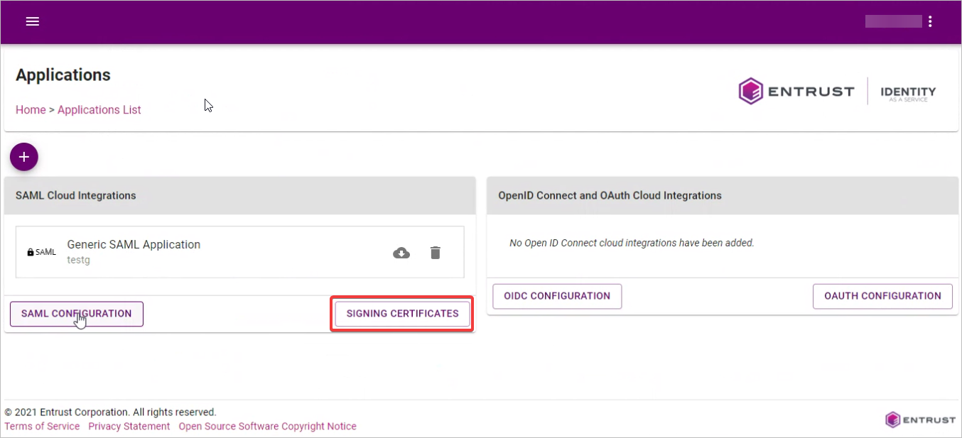 22. Go back to the Entrust Applications List page, and then click on SIGNING CERTIFICATES.