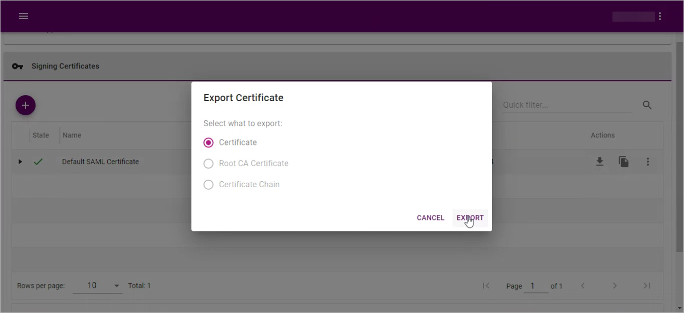 24. Select the Certificate option, and then click EXPORT button.