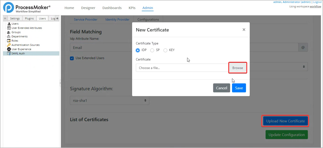 25. In ProcessMaker Configurations tab, click Upload New Certificate and then click Browse.