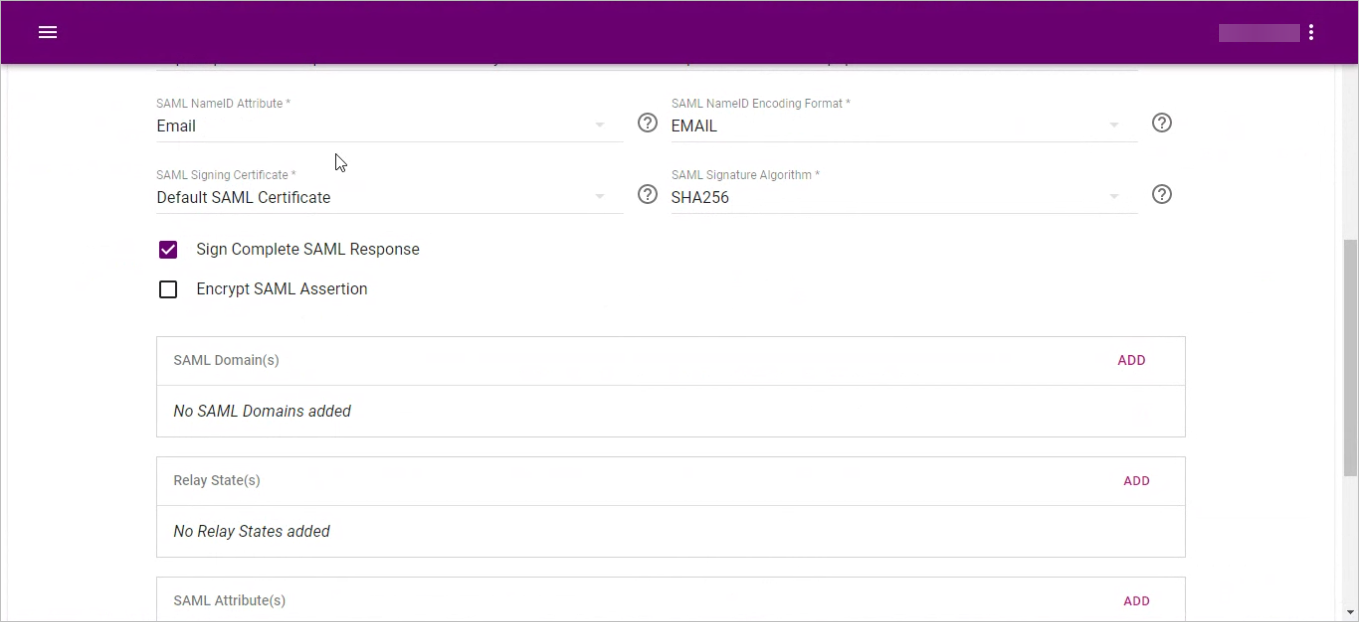 17. Select the SAML NameID Attribute and the SAML NameID Encoding Format. Leave the other attributes by default.
