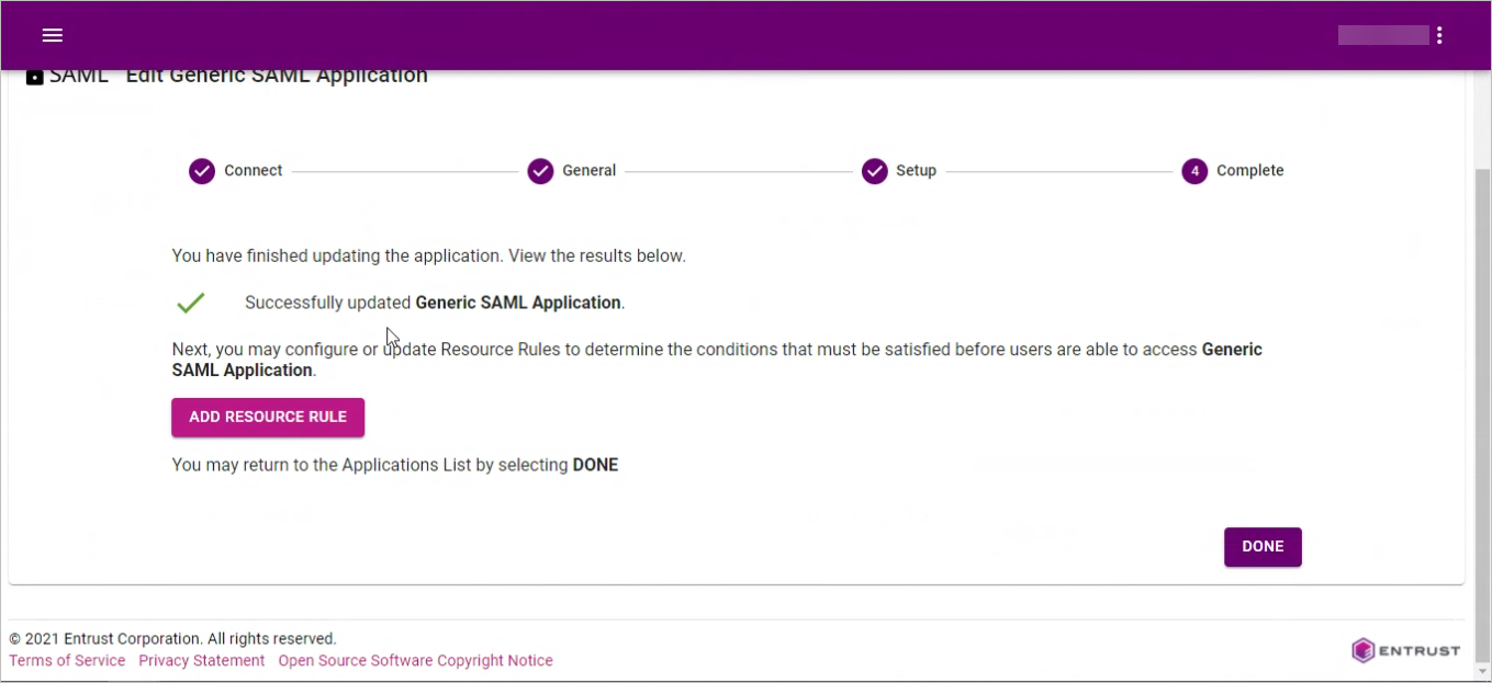 19. Click DONE to complete the application configuration.