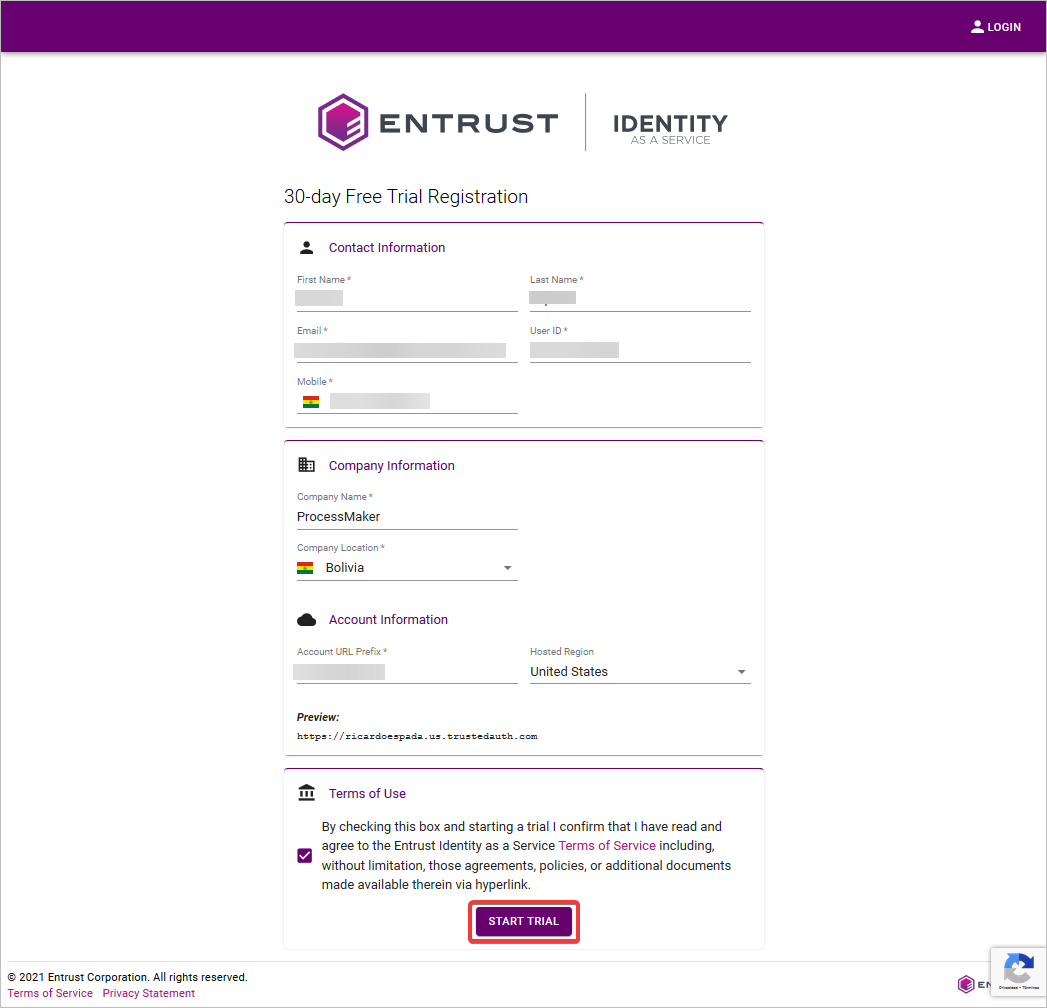 4. After to fill in the new account information, click the START TRIAL button.