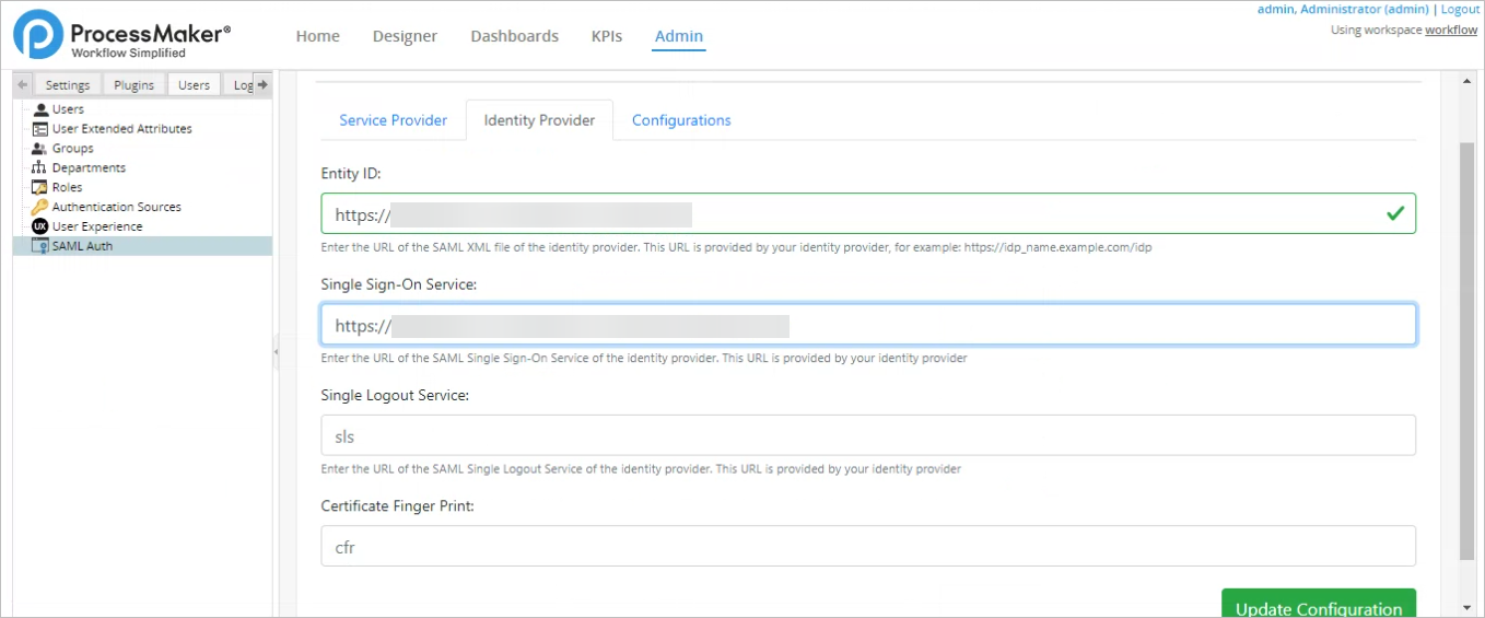 3. Now SAML configuration is required by ProcessMaker in the Identity Provider section. Copy the following fields from Google G-Suite and then click Update Configuration in ProcessMaker: