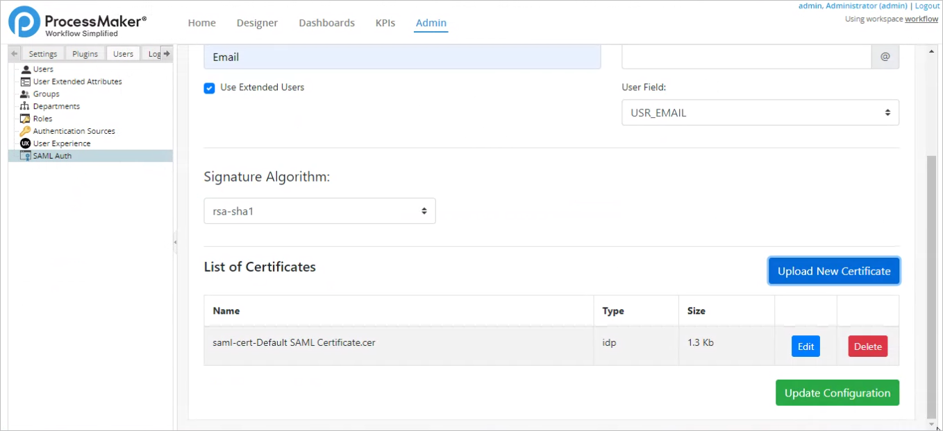 7. In ProcessMaker Configurations tab, click Upload New Certificate and then click Browse.