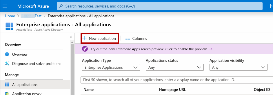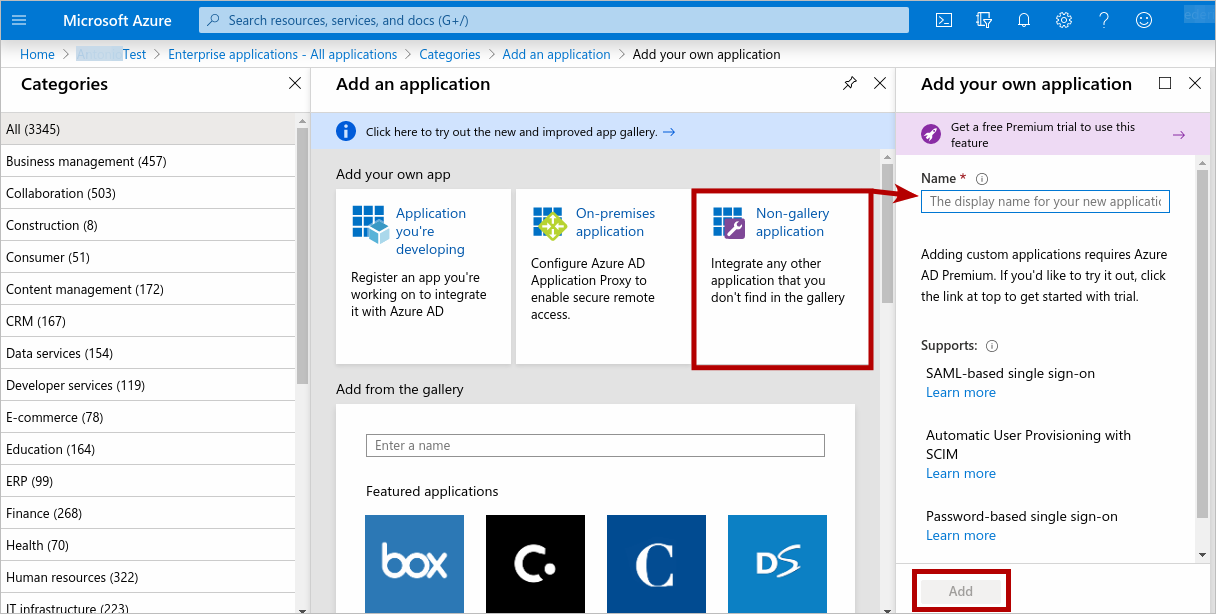 On the Add an application page, click Non-gallery application, type the application name and then click Add.