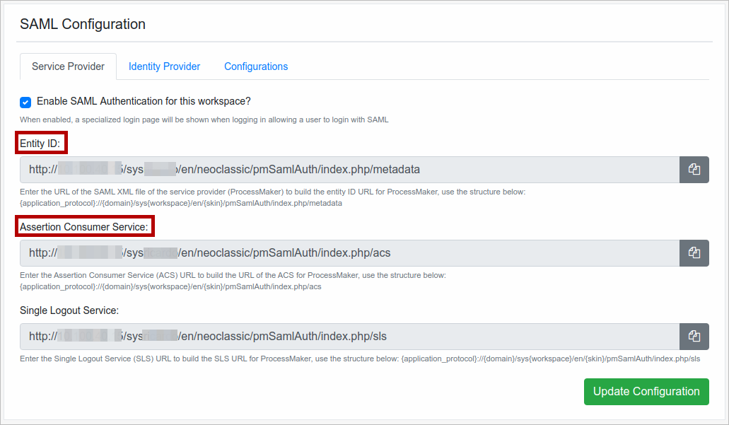 Copy the following values from ProcessMaker Service Provider section (first image below) to the Configuration section in Microsoft Azure:
