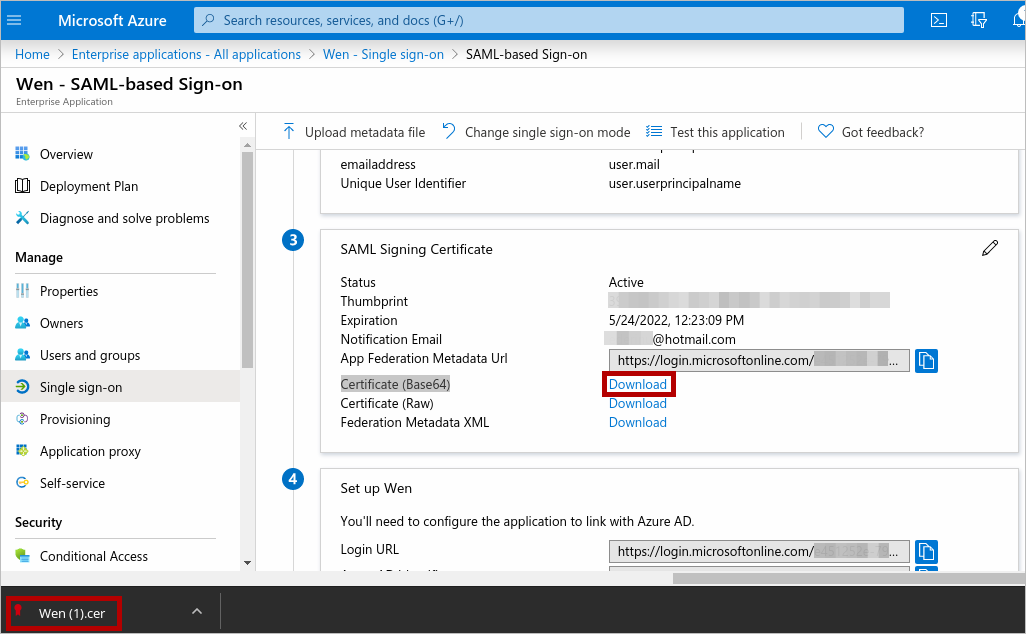 In the SAML Signing Certificate, download the Certificate (Base 64).