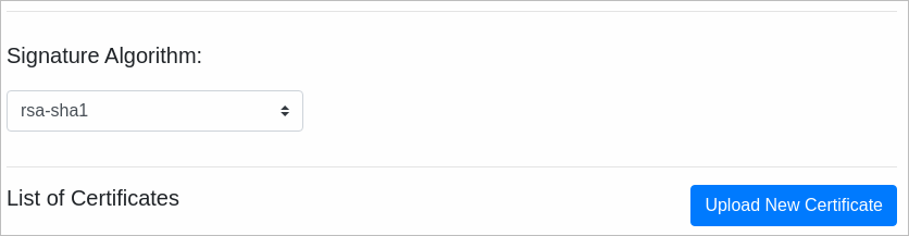 In ProcessMaker, leave the Signature Algorithm field filled in by default. Click Upload New Certificate.