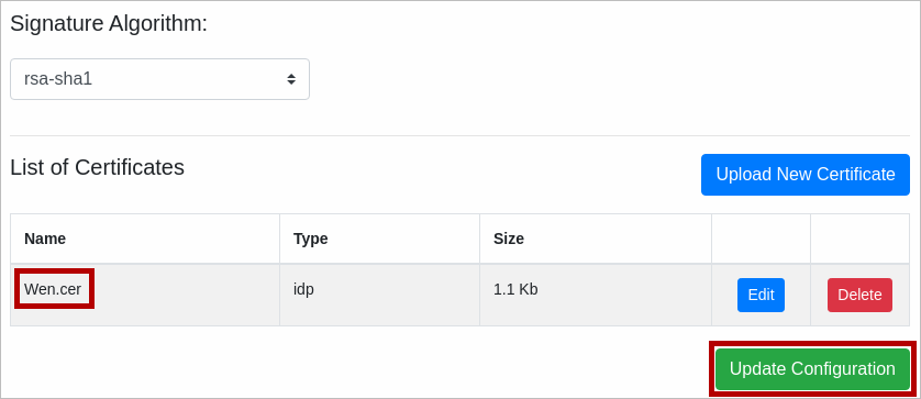 After selecting the downloaded Certificate file, click Update Configuration to apply the changes.