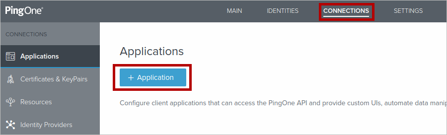 To create a new application, click the Connections tab and then click Application.