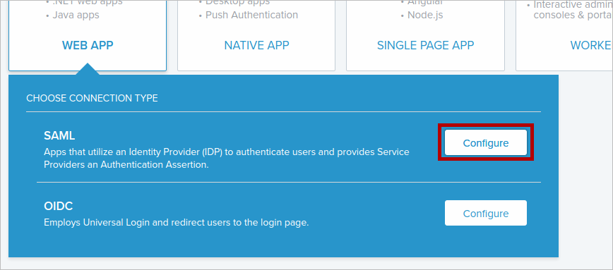 In the CHOOSE CONNECTION TYPE dialog, click Configure on the SAML section.