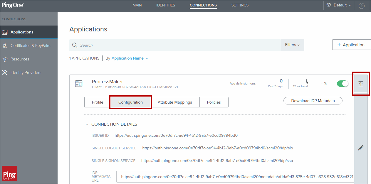 Copy the following fields from PingOne to ProcessMaker in the Identity Provider section, then click Update Configuration: