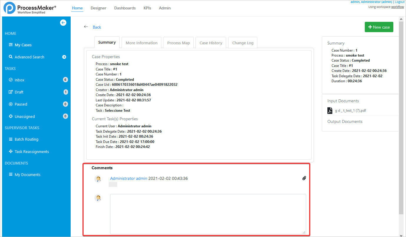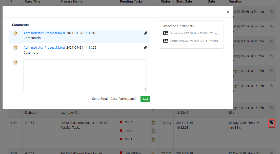The Case Notes option is used to add comments and observations about the case. The last column of the inbox displays an icon with the Case Notes, which is only present in My Cases and Advanced Search sections, available in the Home menu. The only way to see the Case Notes in the Tasks section is by opening the Case Details using the information icon. When the user clicks the icon with the Case Notes, it displays a modal window with a list of all the case notes and attached documents. It also has the options to add new comments and Send Email (Case Participants).
