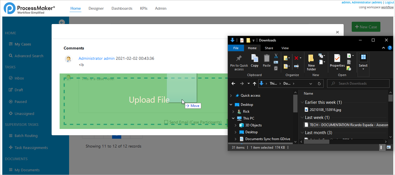 To attach files to the case note, comment the text in the text area, and then drag and drop the file.