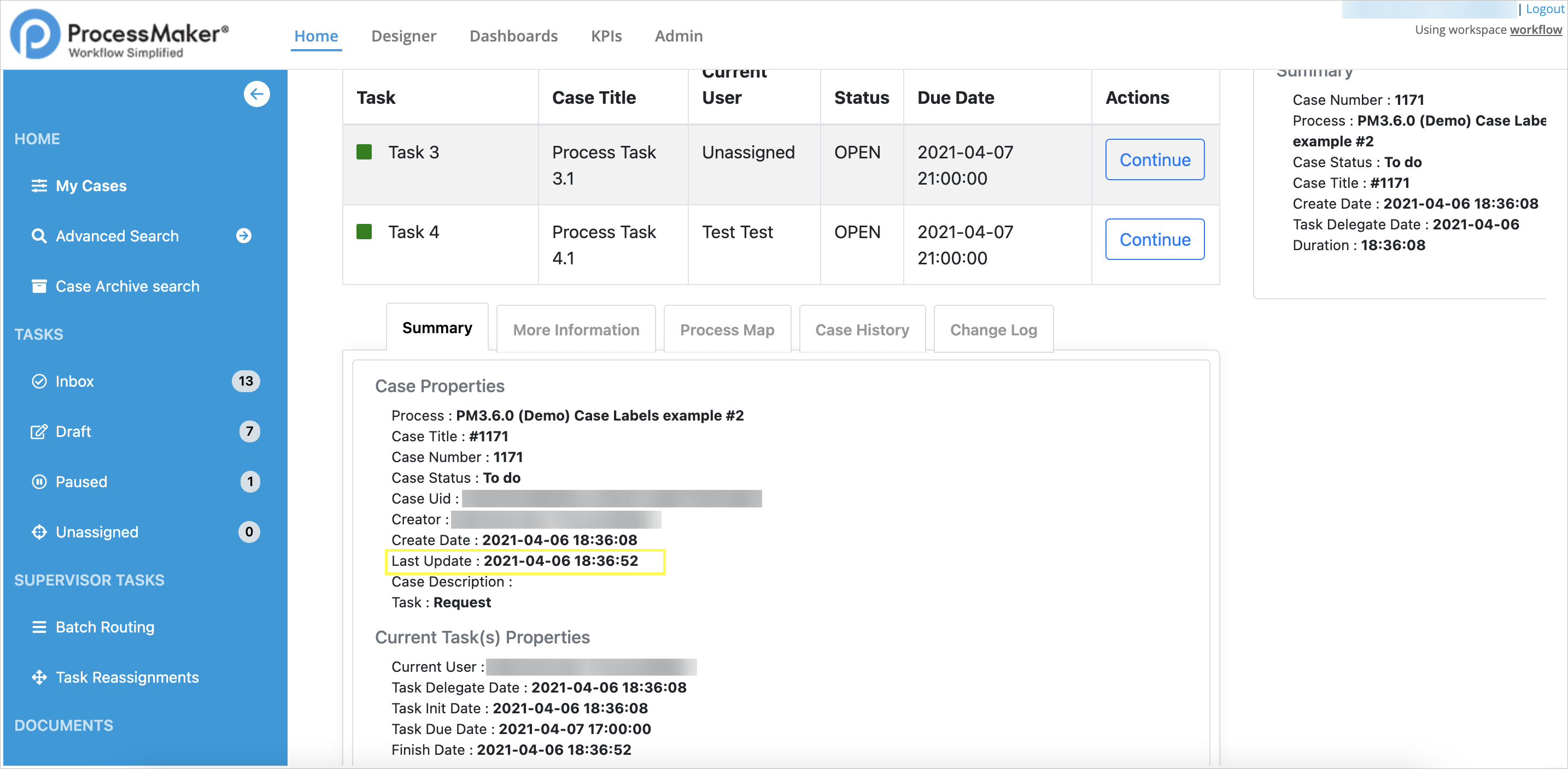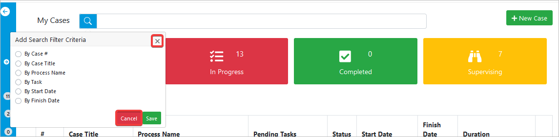 • Supervising: It filters all the cases where the user is a supervisor and the tasks status can be To Do or Unassigned. This option is only available if the user is a supervisor in at least one process. This tab opens the Case Status if there is an open thread where the Supervisor can update the case review.