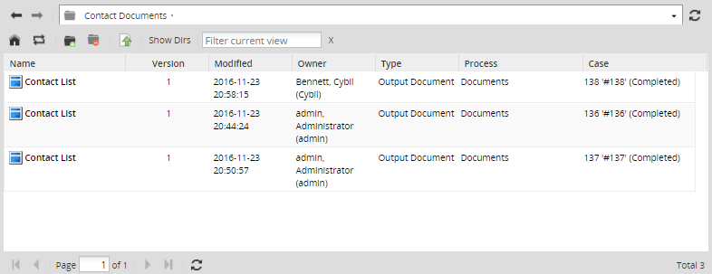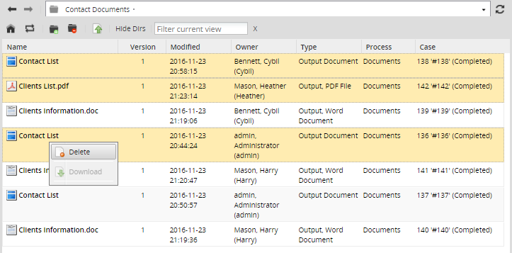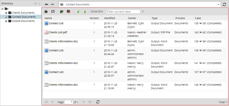 - Process: Name of the process where the file was uploaded or generated. Folders are not associated with a process, even if they were created while running a case, so no information will be displayed.