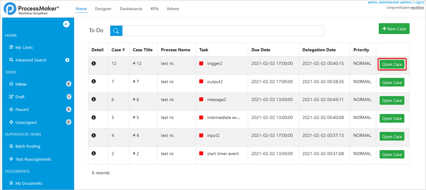 After entering an inbox depending on the case status, by double clicking the row.